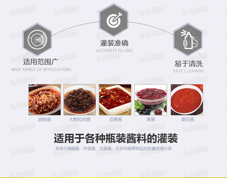 辣椒醬灌裝機 適合于將各類粘稠體及含有各種固體物質(zhì)如辣椒、花生、肉塊、佐料等物體的醬類和油、料分離的火鍋底料等灌裝于各種容器中,辣椒醬灌裝機 適用于辣椒醬、顆粒醬料、大塊肉醬、火鍋底料等的灌裝。辣椒醬灌裝機 /半自動辣椒醬灌裝機可灌裝顆粒漿狀流體物料,特別適用于調(diào)味品中帶顆粒并且濃度較大的辣椒醬、火鍋底料等粘稠醬類的灌裝,配置的自動攪拌器,辣椒醬灌裝機 保證了醬和油的充分混合,又稱為辣椒醬灌裝機、花生醬灌裝機、豆瓣醬灌裝機、果醬灌裝機,芝麻醬灌裝機、粘稠醬類灌裝機、牛肉醬灌裝機。