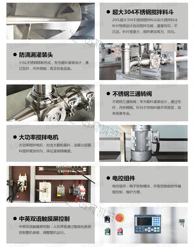 3、醬料灌裝機采用的臥式攪拌結(jié)構(gòu),醬和油可以得到充分混合,極大的提高計量的精度和灌裝性能;