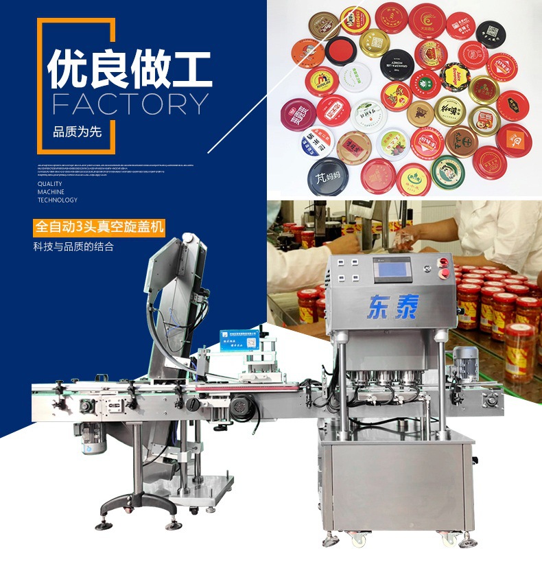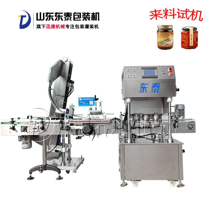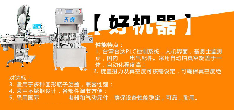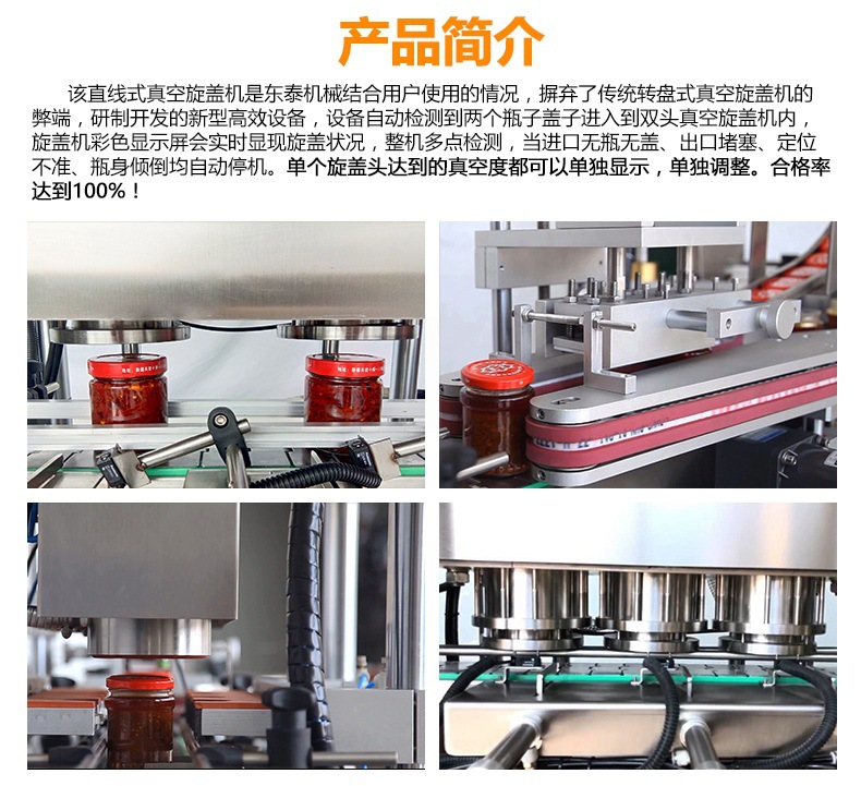 該直線式真空旋蓋機是東泰機械結(jié)合用戶使用情況,摒棄了傳統(tǒng)轉(zhuǎn)盤式真空旋蓋機的弊端,研制開發(fā)的新型高效設(shè)備,設(shè)備自動檢測到兩個瓶子蓋子進入到雙頭真空旋蓋機內(nèi),旋蓋機彩色顯示屏會實時顯示旋蓋狀況,整機多點檢測,當進口無瓶無蓋、出口堵塞、定位不準、瓶身傾倒均自動停機。單個旋蓋頭達到的真空度都可以單獨顯示,單獨調(diào)整。合格