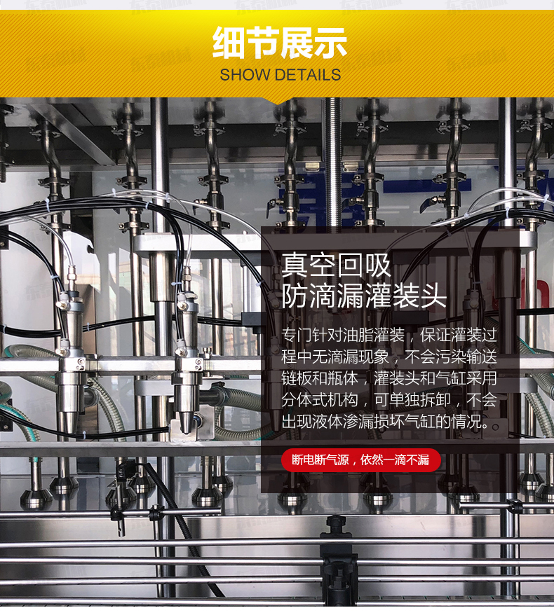 2、設(shè)計(jì)及真空回吸系統(tǒng)保證灌裝過程中無滴漏現(xiàn)象,不會污染輸送鏈板和瓶體。灌裝頭和氣缸采用分體式機(jī)構(gòu),可單獨(dú)拆卸,不會出現(xiàn)液體滲漏損壞氣缸的情況。亞德客氣缸經(jīng)久耐用,其他密封等配件使用標(biāo)準(zhǔn)件,更換維護(hù)簡單方便。
