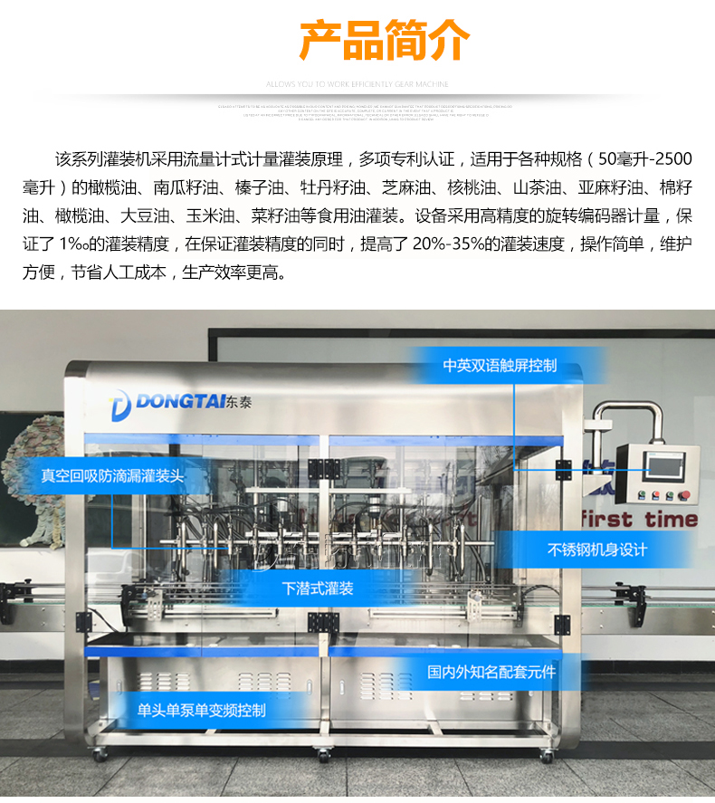 這款食用油灌裝機(jī)應(yīng)用的是流量計式計量灌裝的原理,榮獲了多項(xiàng)認(rèn)證資格,可適用各種容量(1-5升)的南瓜籽油、榛子油、牡丹籽油、芝麻油、核桃油、山茶油、亞麻籽油、棉籽油、橄欖油、大豆油、玉米油、菜籽油等多種食用油的灌裝。這個食用油選用了高精的旋轉(zhuǎn)編碼器計量,使灌裝精度保持在了1%o,在保證樂灌裝誤差的同時,提高了20%-35%的灌裝速率,使用方便,維護(hù)便捷,減少了一部分的人工成本,使生產(chǎn)效率提升。除了進(jìn)桶時間,6頭灌裝機(jī),變頻器在25赫茲的速率進(jìn)行下,每組灌裝的時間為16秒,1350桶/小時;