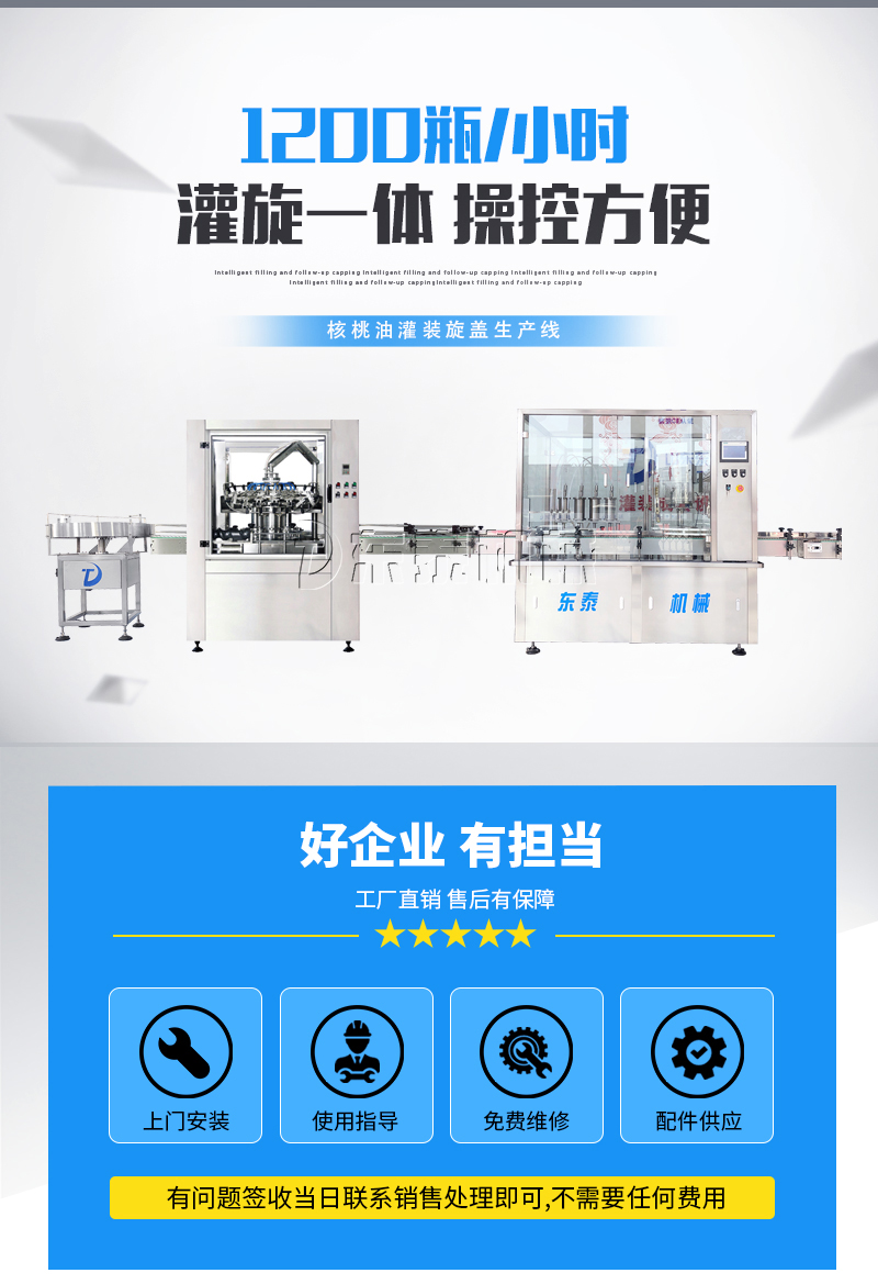 1、本橄欖油灌裝旋蓋機(jī)生產(chǎn)線采用機(jī)械手旋蓋,配備自動打滑裝置,防止瓶蓋損傷。